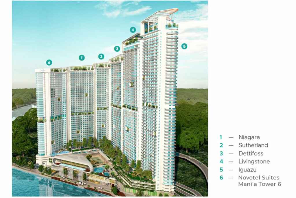 Acqua is built around lush tropical rainforest‑inspired landscaping, water features and abundant greenery despite being in the heart of Metro Manila.